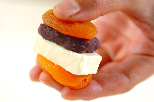アンズでクリームチーズ、粒あんを挟む(2個作る)。