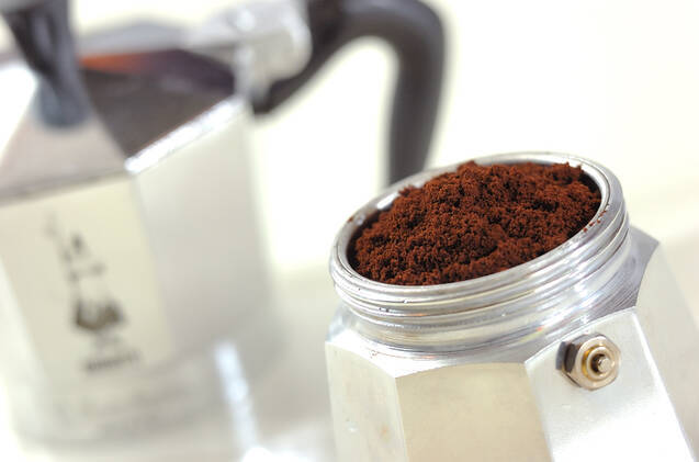 <エスプレッソ>を入れる。エスプレッソメーカーの胴体に水を入れ、ジョウゴ状の網をセットしてエスプレッソ用に挽いたコーヒー豆を入れる。エスプレッソメーカーの上部をセットし火にかけ、ゴーッと言う音がしなくなったら上部と網も外して、エスプレッソコーヒーを140~160ml計る。