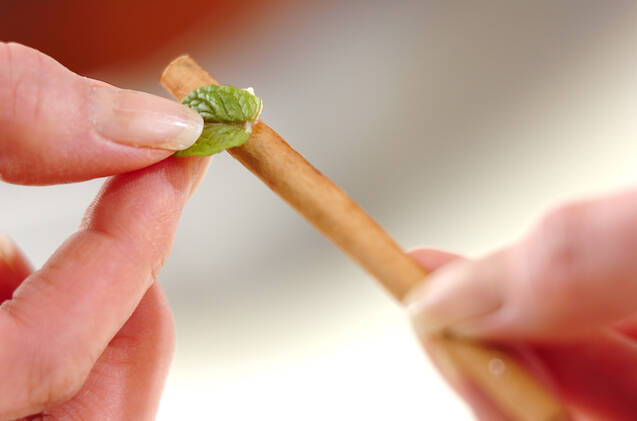 シナモンスティックを縦半分に割る。(5)のカップにココアパウダー、シナモンパウダー、銀箔シュガーを振ってシナモンスティックを刺す。ミントの葉の裏に(5)で取り置いたマスカルポーネ少量をつけてシナモンスティックの先につける。
