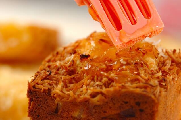 160℃に予熱しておいたオーブンで約50分焼く。焦げそうならアルミホイルをかける。焼けたら型から出し、ケーキクーラーなどにのせる。粗熱を取り、上面にアプリコットジャムをハケでぬる。