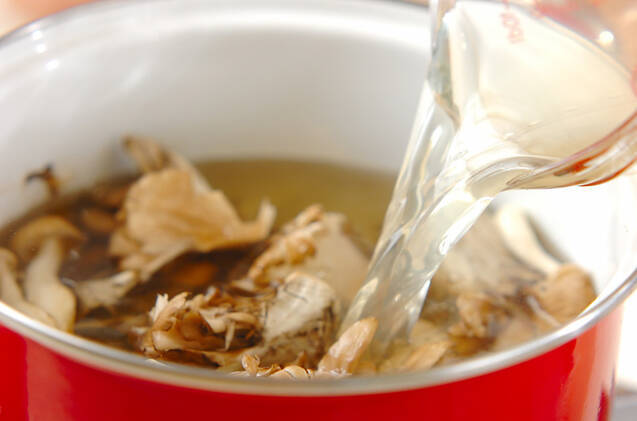 鍋にゴマ油を入れて中火で熱し、シメジ、マイタケを炒め、しんなりしてきたら、だし汁を加える。