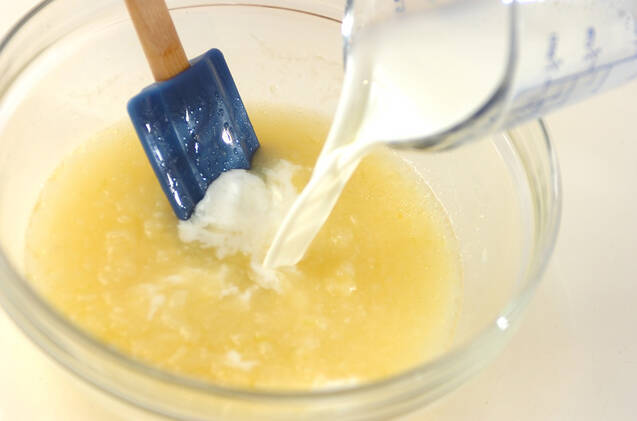 <C>・耐熱ボウルにジャガイモ、おろし玉ネギ、白ネギ、バター、水、顆粒チキンスープの素、塩を入れ、ラップをかけて電子レンジで10分位加熱する(ジャガイモに竹串がスッと刺さったらOKです)。ハンドミキサーでかくはんし、またはマッシャーでジャガイモをつぶし、牛乳と合わせてコショウで味を調え、冷蔵庫で冷やす。