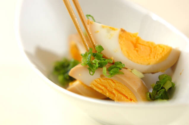 ゆで卵にからめた<合わせみそ>を取り除き、お好みの大きさに切り分け、刻みネギを散らす。