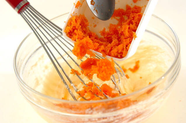 ニンジン、粉類、オートミール、クリームチーズを順に加えて混ぜ合わせる。