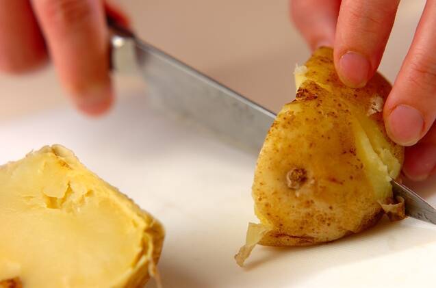 ジャガイモは皮ごと水洗いしラップに包んで、電子レンジで5~6分加熱し、4~5等分に切る。