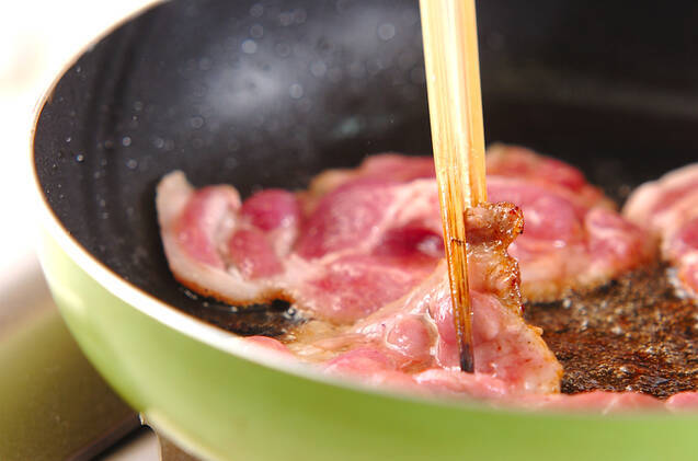フライパンにサラダ油を熱し、肉を広げながら3~4枚ずつ中火で両面を焼き、そのつどいったん取り出しておく。