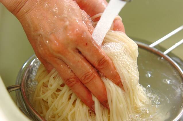 別の鍋に分量外のたっぷりの水を沸かし、沸騰したらうどんを入れ、袋の表示時間通りゆで、ザルに上げる。流水でしっかりぬめりを取り、冷やす。