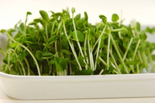 <付け合わせ>の豆苗は根元を切り落とし、長さを3等分に切る。