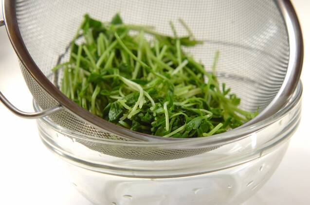 耐熱のボウルに豆苗を入れ、ラップをかけて電子レンジで2分加熱し、ザルにあげる。