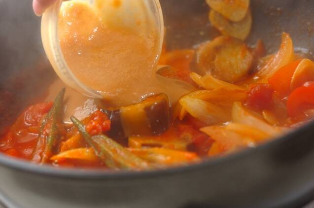 油がまわったら、オクラ、水煮トマト、酒、水を加え、蓋をして10分程煮る。水で溶いたみそを加え、さらに5分程煮る。塩コショウで味を調え、器に盛り、大葉をのせる。