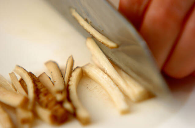 ゴボウはたわしできれいに水洗いし、長さ5cmの細切りにして水に放つ。