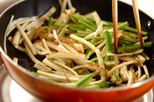 フライパンにゴマ油を強火で熱し、水きりしたゴボウを加える。ゴボウがしんなりしたら、ピーマンを加えて炒め合わせる。