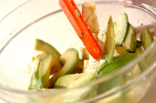 ボウルに<調味料>の材料を入れ、アボカドとクリームチーズを加えて和える。器に盛り、プチトマトを添えてかつお節をかける。