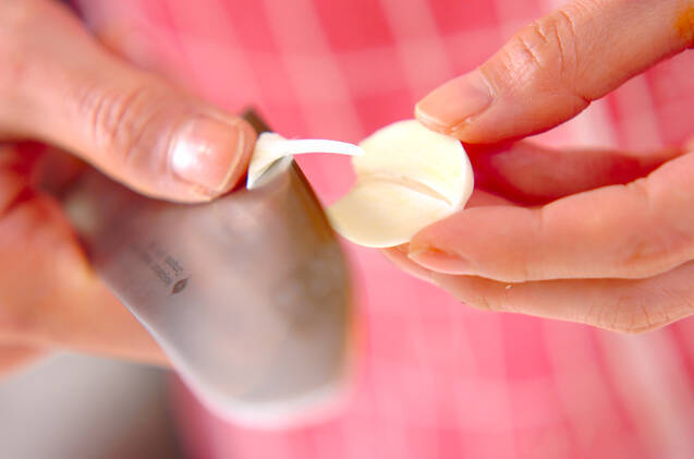 ニンニクは皮をむいて縦半分に切り、芽を取ってみじん切りにする。
