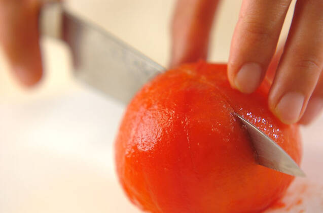トマトはヘタをくり抜き、熱湯につけて皮が少し破れたら、すぐに冷水に取って皮をむく。切り離さないように6~8つに切り込みを入れる。