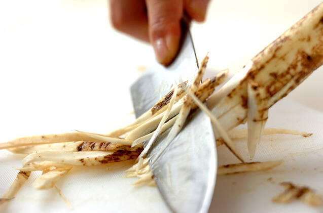 ゴボウはタワシできれいに水洗いし、ささがきにして水に放ち、ザルに上げてしっかり水気をきる。