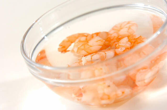むきエビは塩を入れた熱湯でゆでて水に取り、粗熱が取れたら水気を拭き取る。