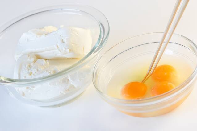 クリームチーズは常温に戻しておく。卵は溶きほぐす。オーブンを220℃に予熱しておく。
