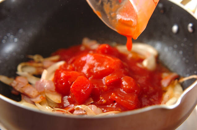 (1)のフライパンにオリーブ油を熱し、ベーコンと玉ネギを炒め、しんなりしたら水煮トマト、生クリーム、顆粒スープの素、砂糖、塩コショウを入れて4~5分煮る。