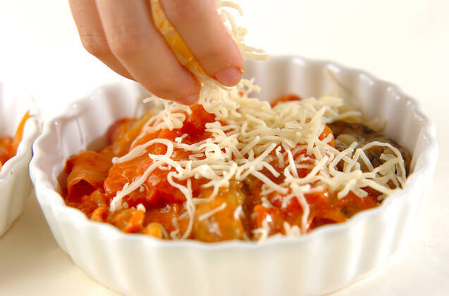 (1)のカキを戻し入れ、サッと煮て耐熱容器に分け入れる。ピザ用チーズを散らし、250℃に予熱しておいたオーブンで10~12分、おいしそうな焼き色がつくまで焼き、ドライパセリを振る。