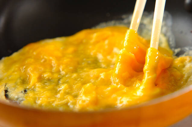 小鍋に<ソース>の材料を入れて火にかけ、ひと煮たちさせる。卵は溶きほぐして2つに分ける。フライパンにサラダ油を入れて中火で熱し、溶き卵を流し入れ、菜ばしで混ぜながらお好みの柔らかさになったら、(1)のご飯にかぶせるようにのせる。残りも同様に繰り返す。