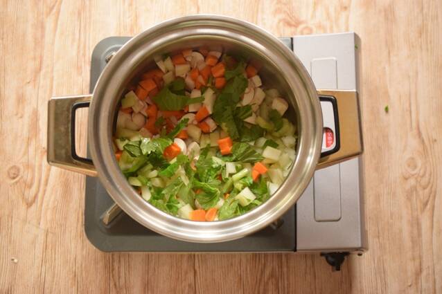 ニンジン、セロリ、マッシュルームを加え、分量外の塩をふり、しんなりするまで炒める。
