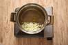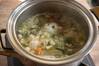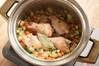 野菜を鍋の端によせ、鶏手羽元とローリエを入れる。表面に軽く焼き色を付けたら、水と酢を注ぎ、強火にかける。