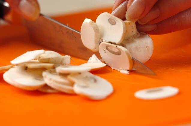 お米は水洗いしてザルに上げておく。マッシュルームは薄切りにする。