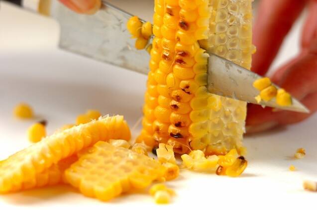 トウモロコシは魚焼きグリルで表面を焼いてから、包丁で実をこそげる。