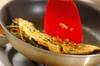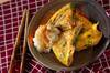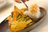 熱したフライパンにゴマ油をひき、(1)を一気に流し入れる。半熟状になったら半分に折り返し、両面焼いたらまな板にのせ、4等分に切って皿にのせる。