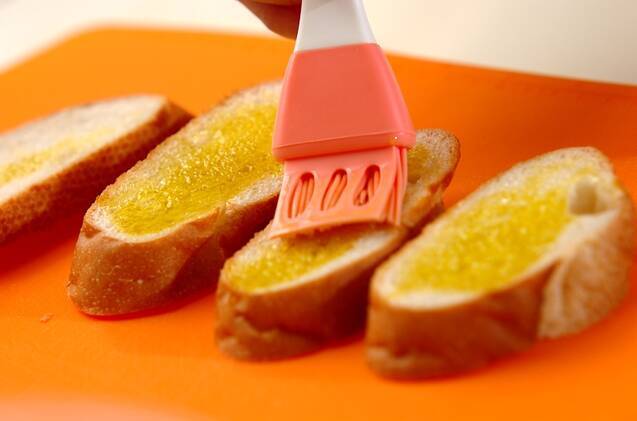 フランスパンは約1cmにスライスし、片面にオリーブ油をぬる。(1)のソラ豆、パルメザンチーズをのせ、塩、粗びき黒コショウを振る。