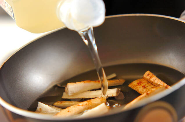 深めのフライパンに、<ミツ>の材料を入れて煮詰める。別のフライパンに新ゴボウを入れ、常温の揚げ油を新ゴボウがかぶる位まで注ぎ、中火にかける。