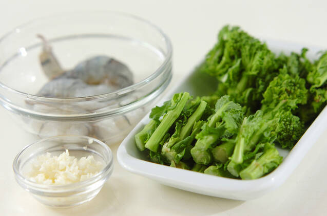 エビは殻と背ワタを取り除き、塩水で洗って水気をきり、<下味>の材料をまぶす。菜の花は根元1cmを切り落とし、長さを半分に切る。ニンニクは芽を取り除き、みじん切りにする。