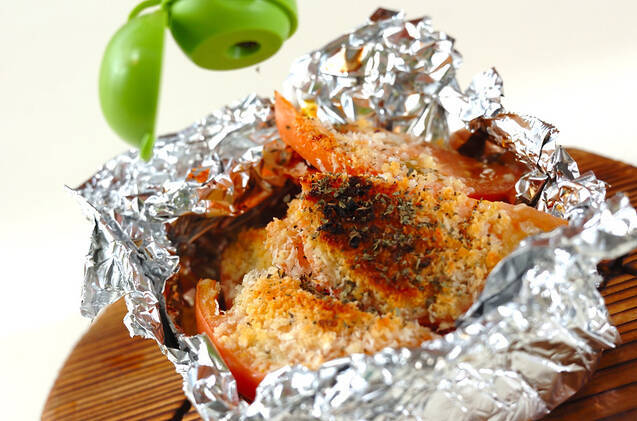 (1)に粉チーズ、パン粉をのせ、トースターで焼く。パン粉に焼き色がついたら取りだし、バジルを振る。