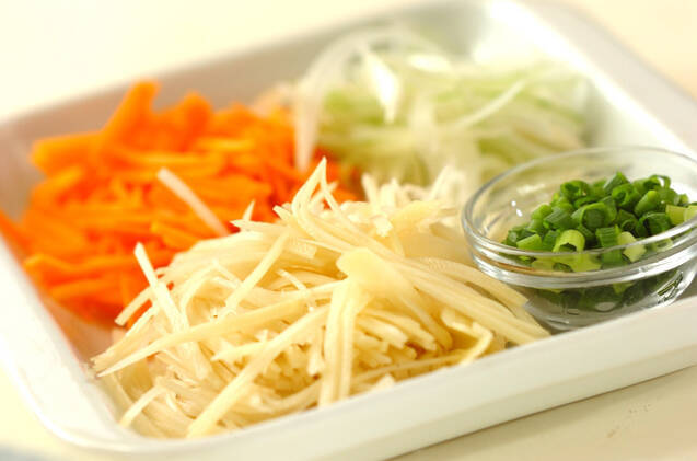 ジャガイモは皮をむきスライサー等で細切りにし、水に放つ。水を変え、白く濁らなければザルに上げる。ニンジンは皮をむいて縦細切りにし、玉ネギは縦薄切りにする。