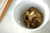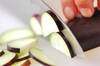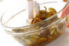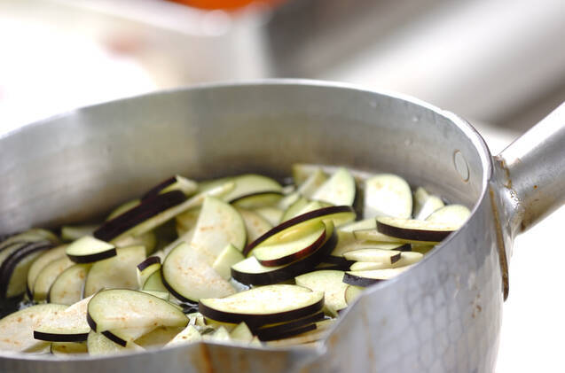 たっぷりの熱湯に塩少々を入れ、ナスを加え、少し柔らかくなる位にゆでる。ザルに上げ、水気を軽く絞る。