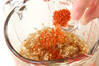 <つけダレ>を作る。ニンニク、皮をむいたショウガをみじん切りにし、おろしリンゴ、酒、しょうゆ、白ゴマ、赤唐辛子粉を加えてよく混ぜ合わせる。