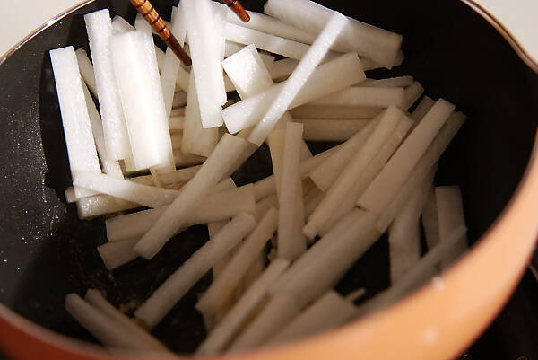 <ナムル・大根>を作る。大根は皮をむき、縦せん切りにし、フライパンにゴマ油、おろしニンニクを入れて中火にかける。香りが立ってきたら大根を加え、大根が透き通ってきたら火を止める。粗熱が取れたらレモン汁、すり白ゴマ、塩、コショウをからめる。