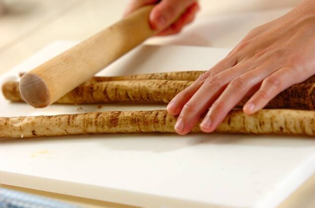 ゴボウはタワシでキレイに水洗いし、めん棒等で叩き割り、長さ4cmに切る。牛肉はザク切りにする。