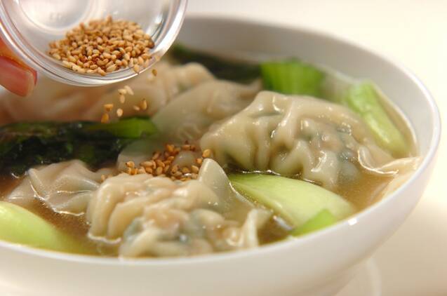 器にアツアツの餃子をスープごと注ぎ、白ゴマを振る。
