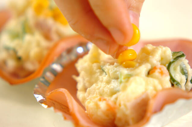 カップにハムを入れて、ポテトサラダを中央にのせ、水煮コーンを飾る。