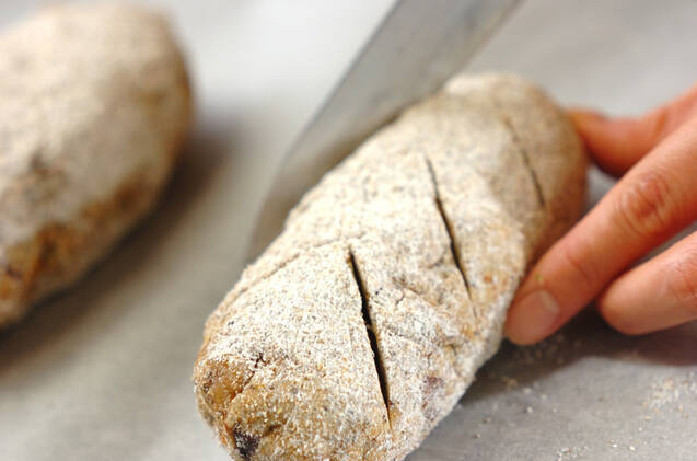 作業台に分量外のライ麦粉を振り、その上で(4)を転がしてライ麦粉を表面につける。とじ目を下にして、包丁で6本切り込みを入れる。
