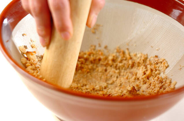 煎ったクルミはすり鉢ですり(ハンドプロセッサーで細かく砕き)、他の<和え衣>の材料と混ぜ合わせる。