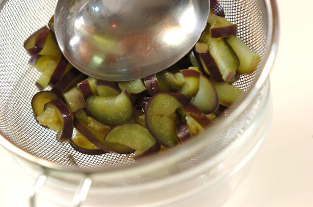 (1)の熱湯に水きりしたナスを入れ、煮たったら2~3分ゆでてザルに上げる。お玉などで押さえてしっかり水気をきり、(1)の<和え衣>のボウルに加えて和え、器に盛る。