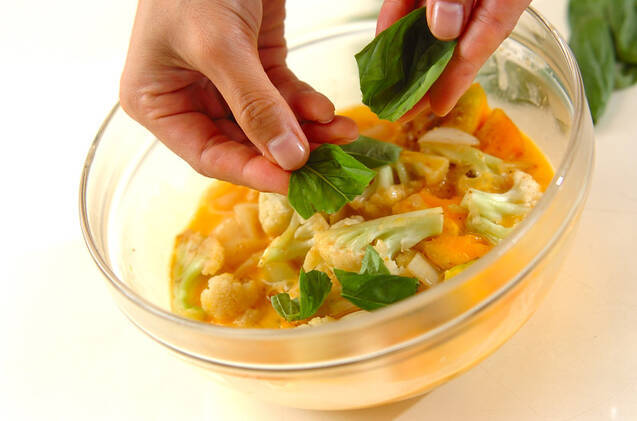<卵液>に(1)とバジルを手でちぎりながら加え、混ぜ合わせる。耐熱容器に流し込み、ピザ用チーズをのせる。200℃に予熱しておいたオーブンに入れ、表面に焼き色が付くまで15~20分焼く。