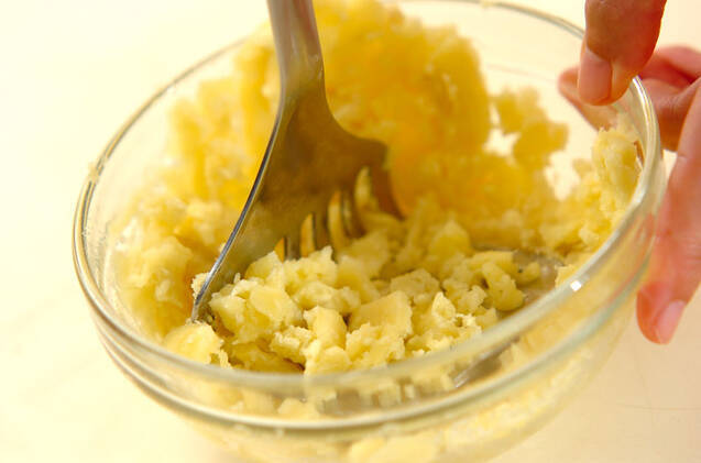 サツマイモは皮をむいてひとくち大に切り、水にさらして水気をきる。耐熱容器に入れてラップをし、電子レンジで2~3分加熱する。マッシャーで潰す。玉ネギはみじん切りにする。オーブンを170℃に予熱しておく。