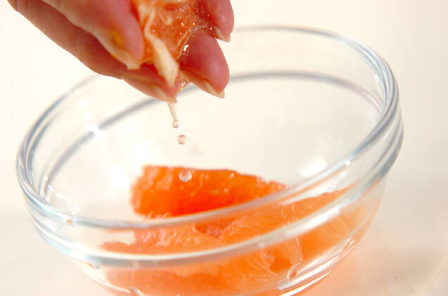 グレープフルーツは包丁で皮をむき、中の薄皮も取ってひとくち大に切る。残りは搾っておく。