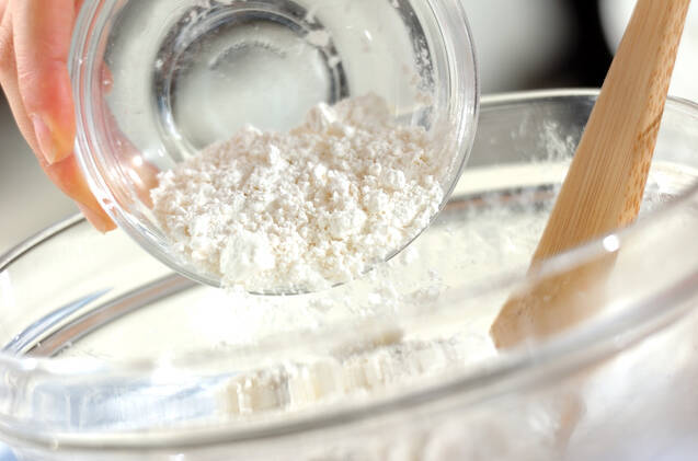 ボウルに里芋を入れてマッシャーでつぶし、砂糖を加える。全体に混ざったら薄力粉と塩を加え混ぜ、ラップをして電子レンジで2分加熱する。電子レンジは600Wを使用しています。