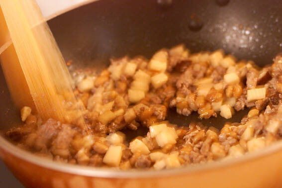 フライパンにサラダ油を熱し、ショウガを炒め、香りが立てば、納豆、干シイタケ、水煮タケノコを炒める。
