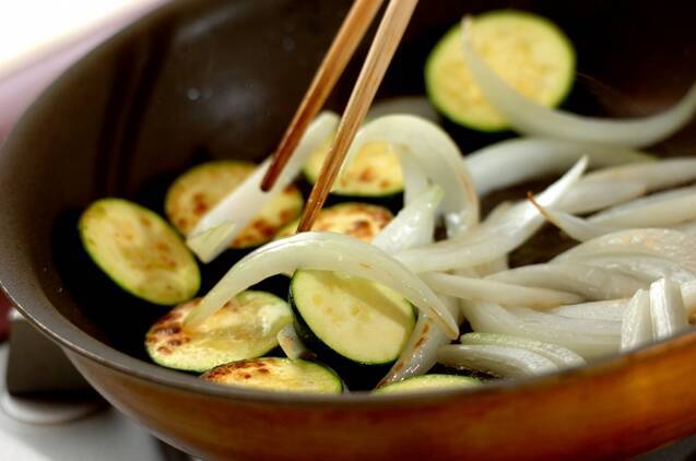 フライパンにサラダ油を入れ、中火にかける。玉ネギとズッキーニを入れ、分量外の塩少々を加えて炒める。